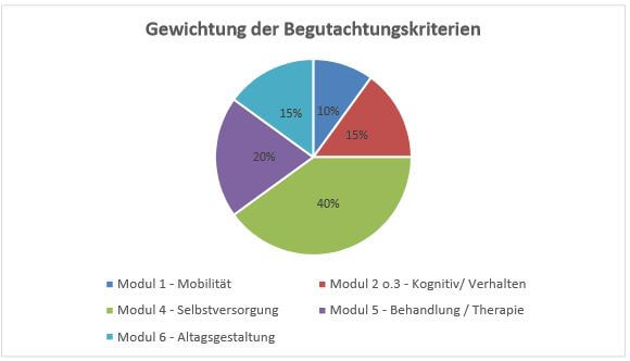 Bei der Festlegung des Pflegegrades fließen die zuvor genannten Module in unterschiedlicher Wertigkeit bzw. Prozentsätzen ein.